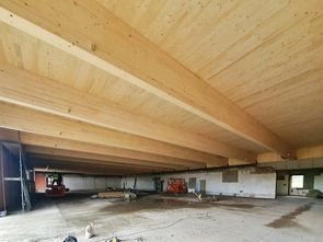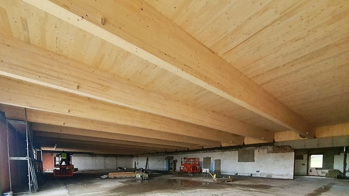 Dokončujeme montážní práce na střešní konstrukci prodejny Penny Market Dobruška. Nosná konstrukce je tvořena stropy z CLT a nosníky z BSH.