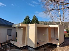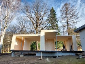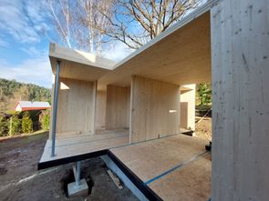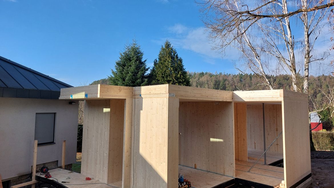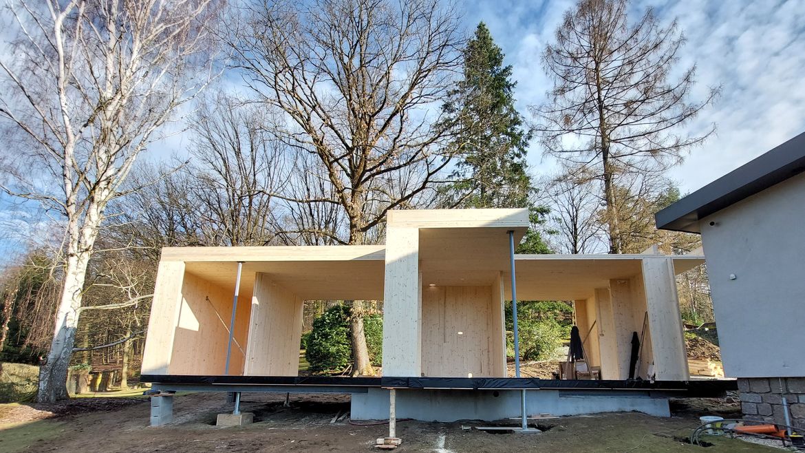 Dokončili jsme montáž přístavby rodinného domu ve Středních Čechách z CLT panelu Stora Enso. Založení na ocelových nosnících a konzolách.