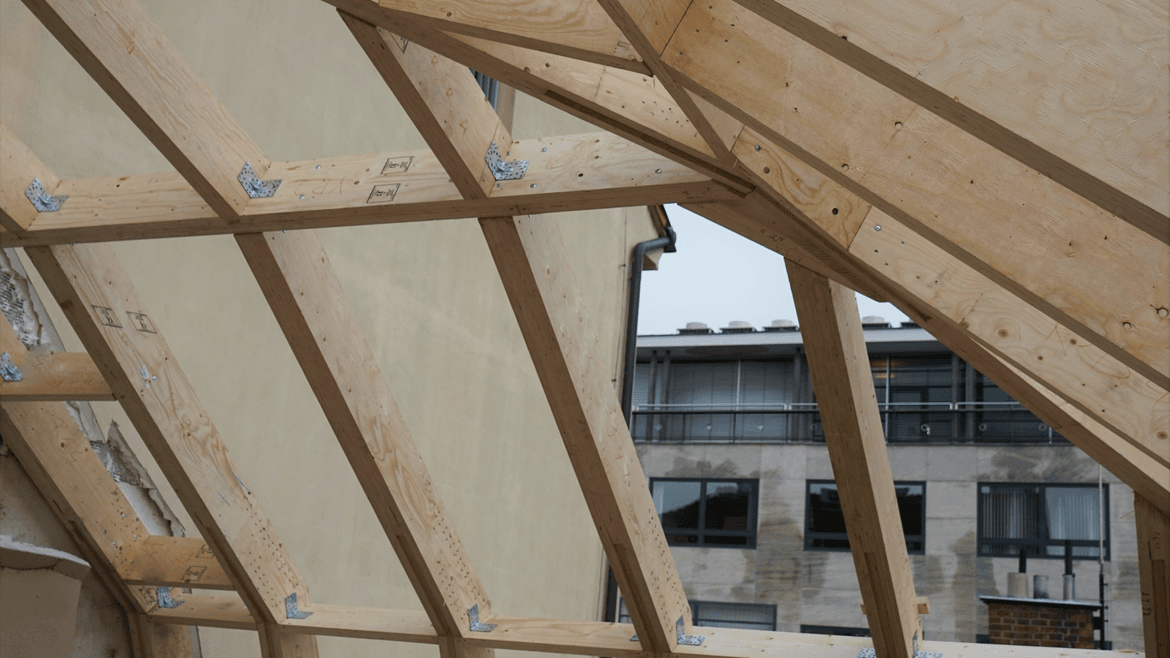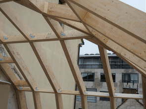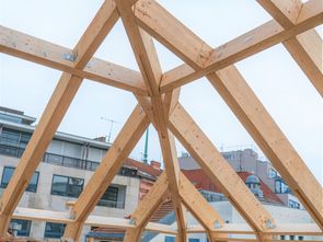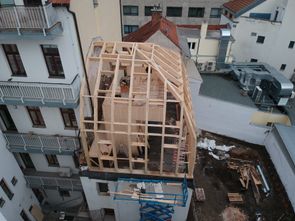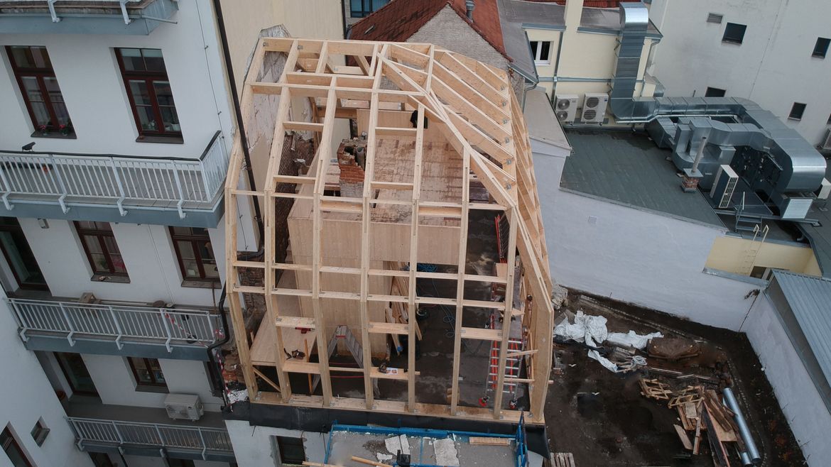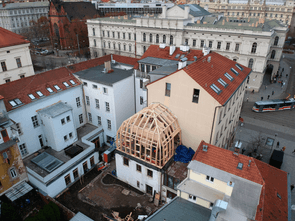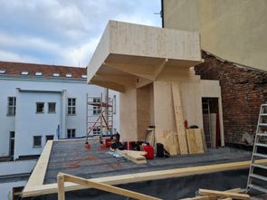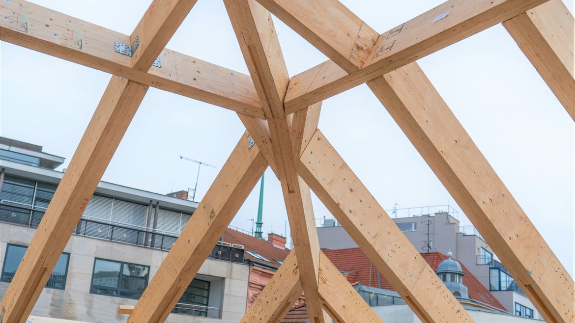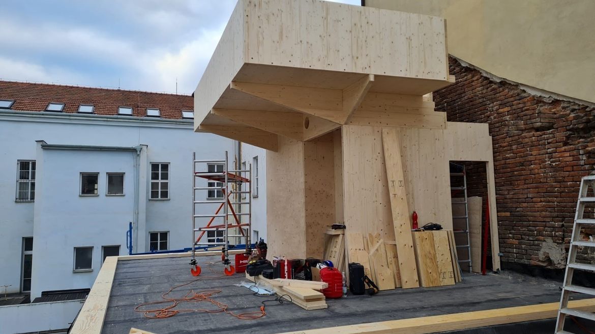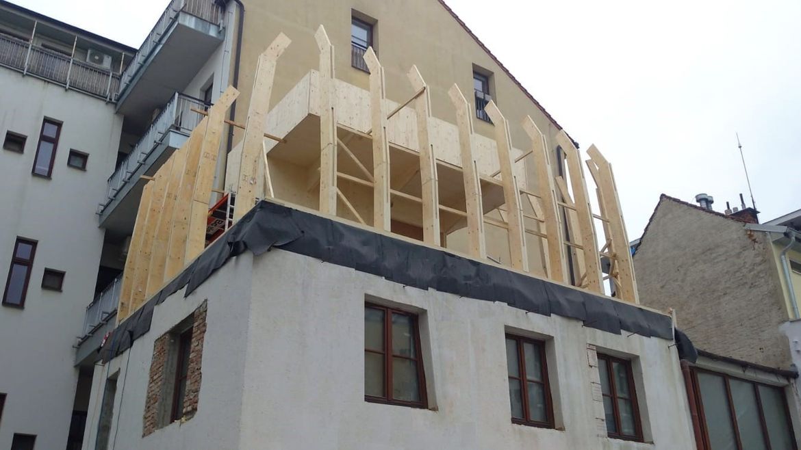 Na konci roku 2021 jsme v samém srdci Brna, v místě s nebývale složitým přístupem, bez pomoci jakékoliv montážní techniky dokončili montážní práce na krásné vestavbě kancelářských prostor pod kopulí z materiálu LVL